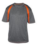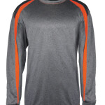 Snowy Heather fabric is a polyester knit with high mechanical stretch Bold, two-color heather pattern achieved in the dye process allowing for risk free decoration Raglan sleeves for a greater range of motion Fit Type: Classic